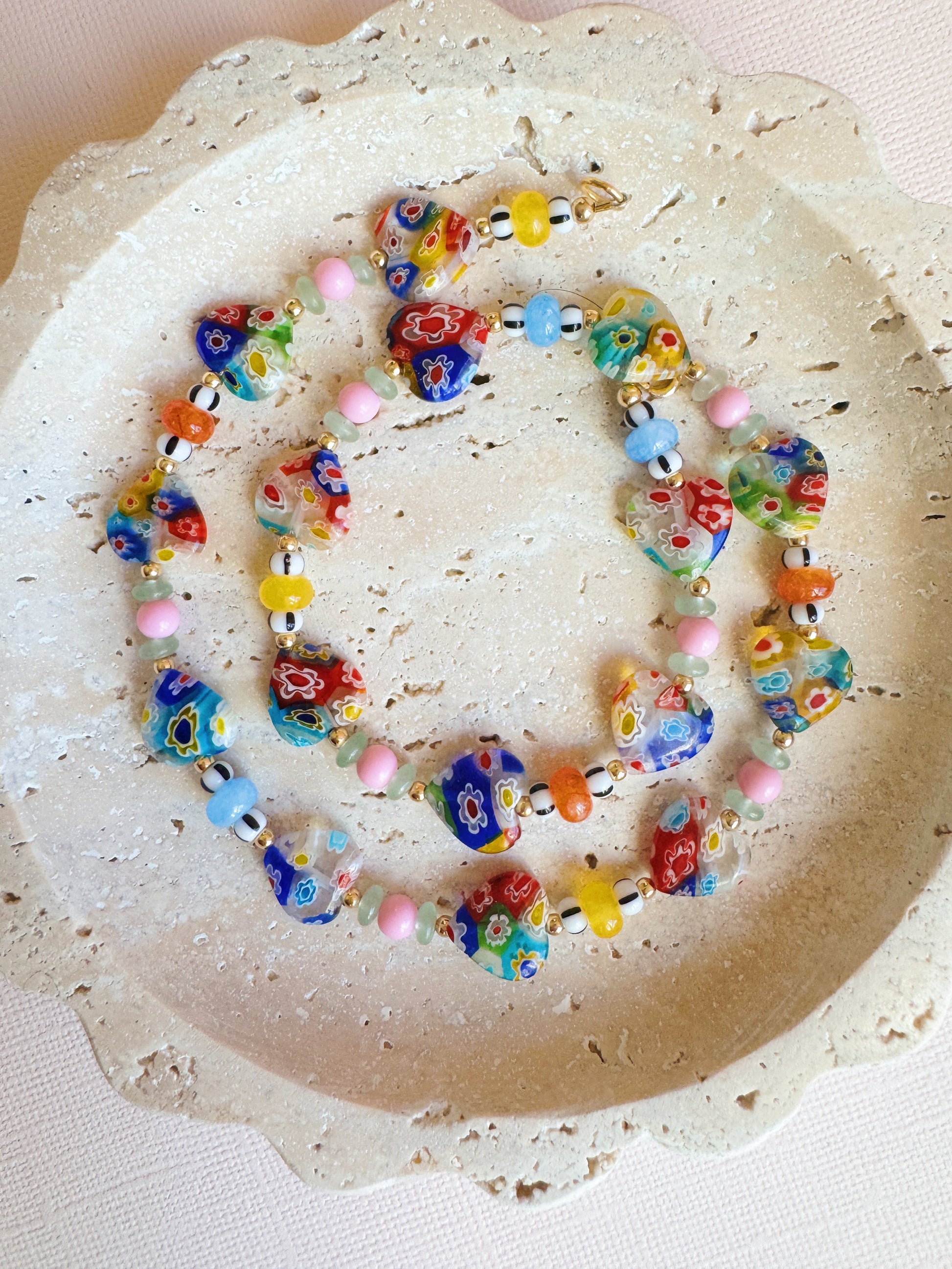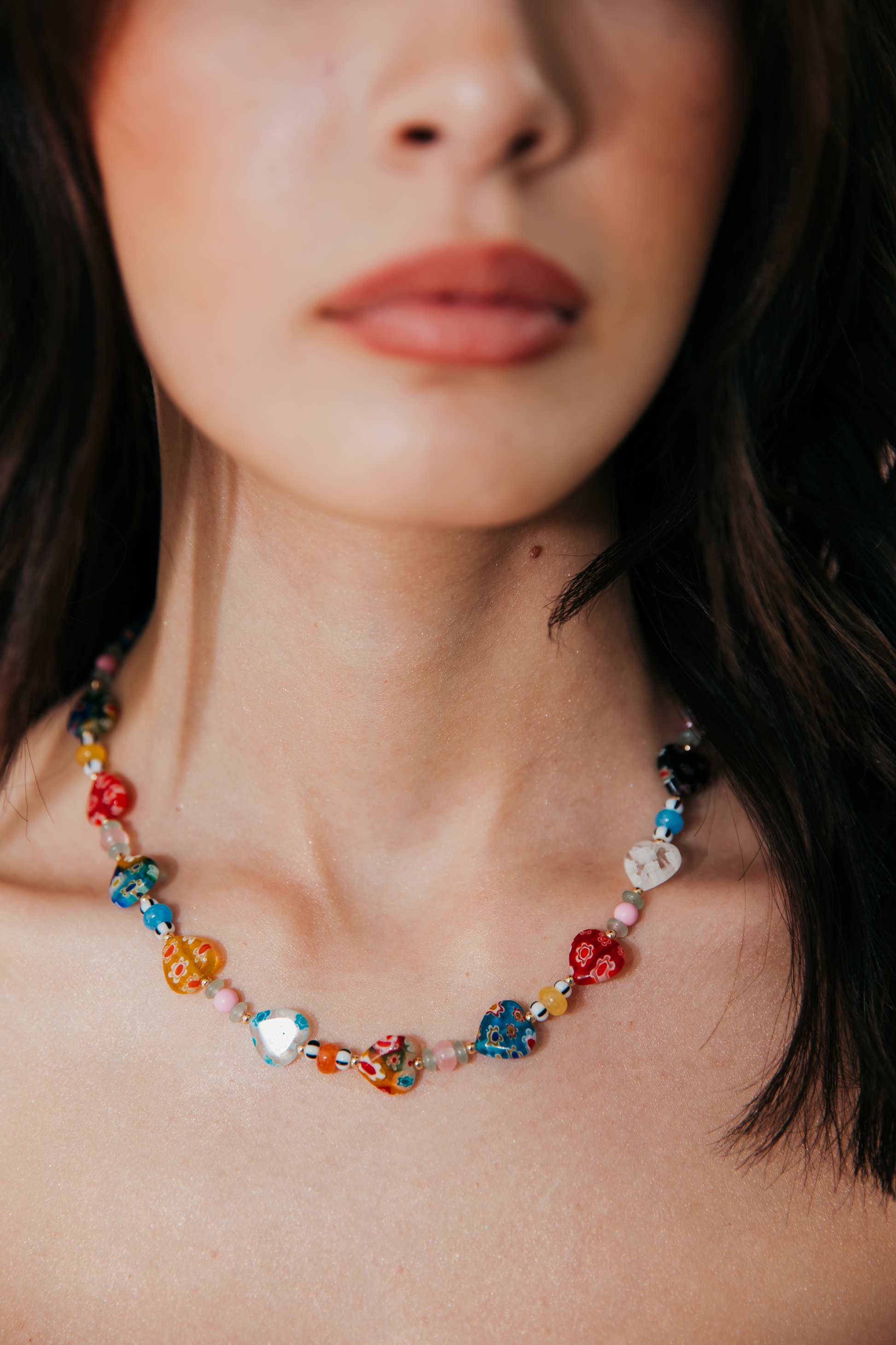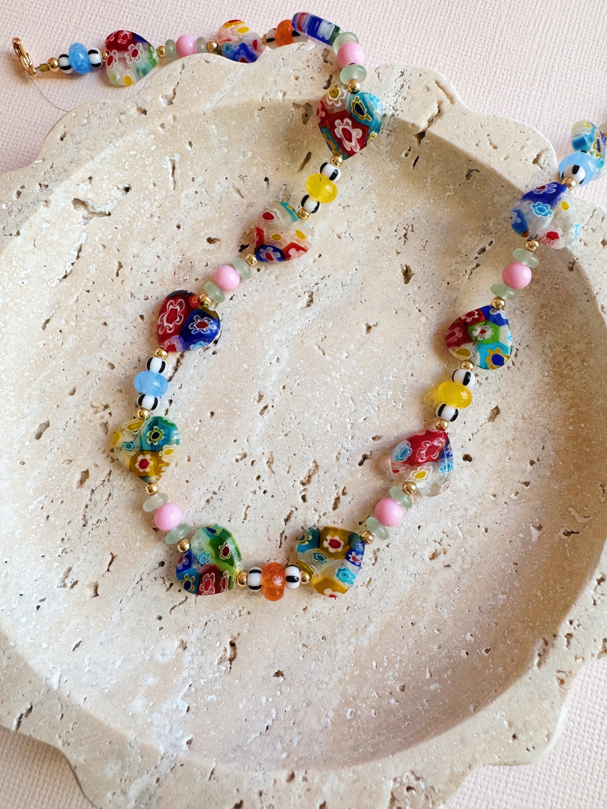 Glass heart beads with a variety of mixed beads. Gold filled material for hardware