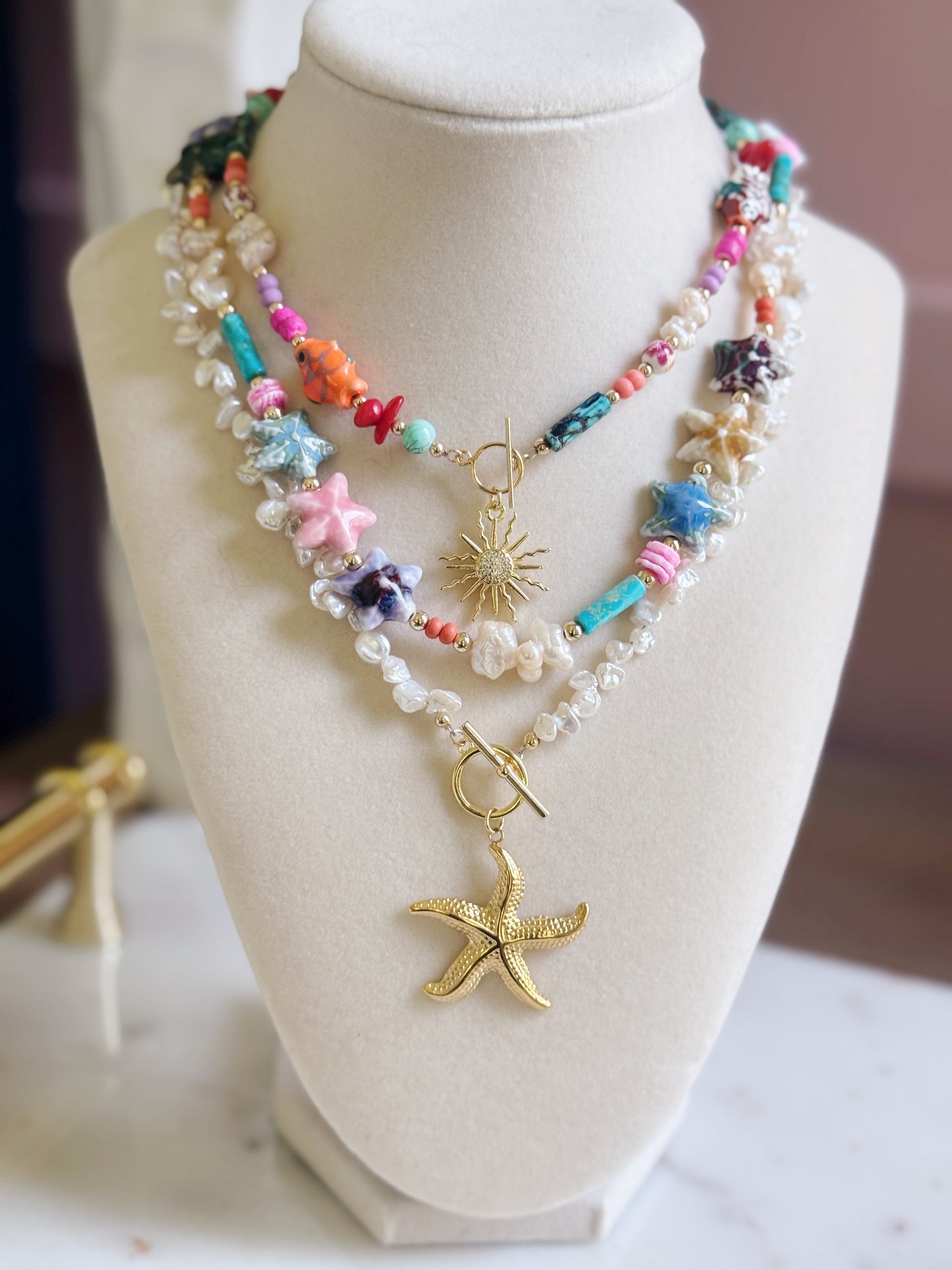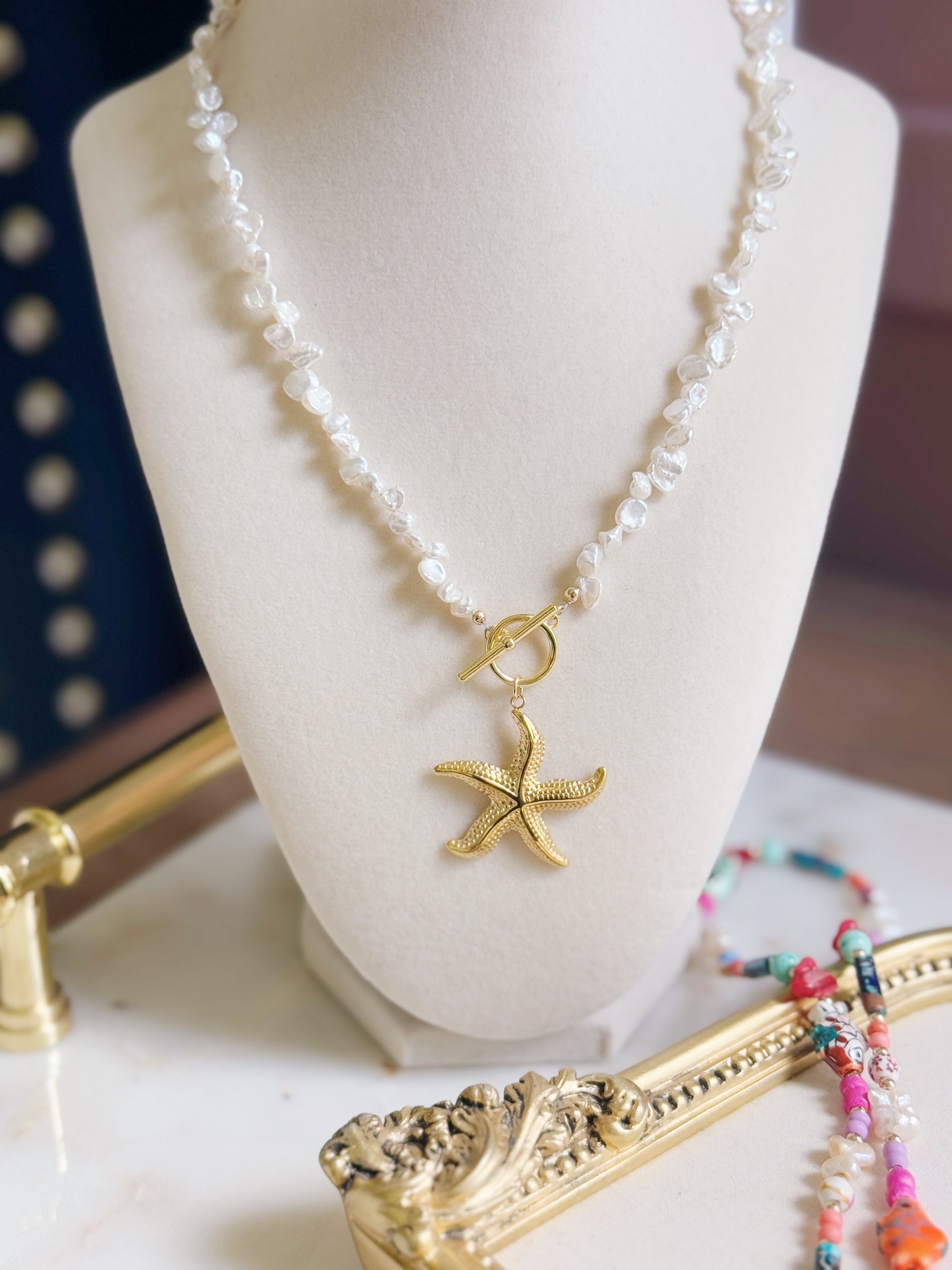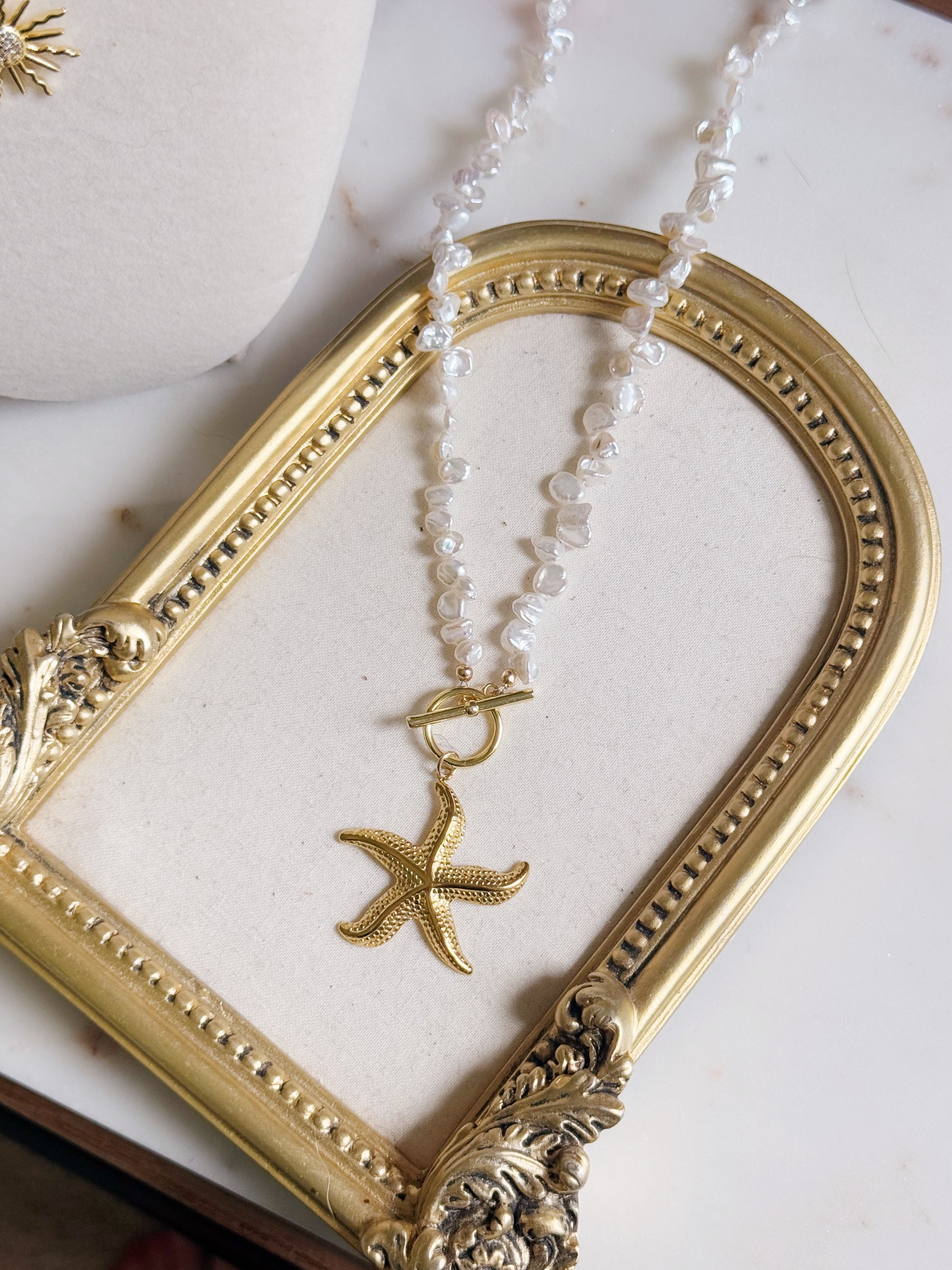 Meet Francesca, the sweetest little stunner your necklace stack has been dreaming of. With glossy nugget pearl beads and the cutest starfish charm stealing the spotlight, she’s all things beachy and beautiful. The toggle closure adds a touch of charm, and at 17.5 inches long, she’s the perfect layering buddy. Bonus? She's totally waterproof — beach, pool, or spontaneous dance in the rain? She’s down.