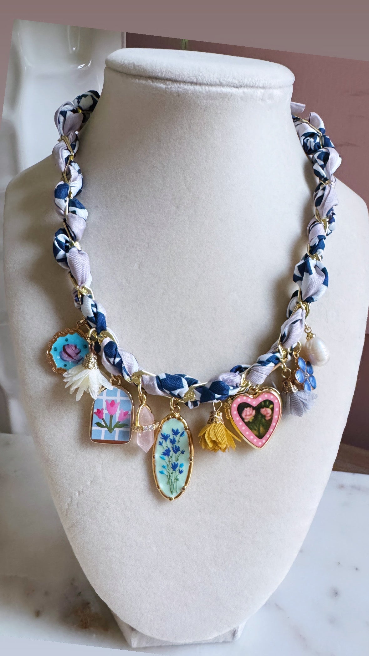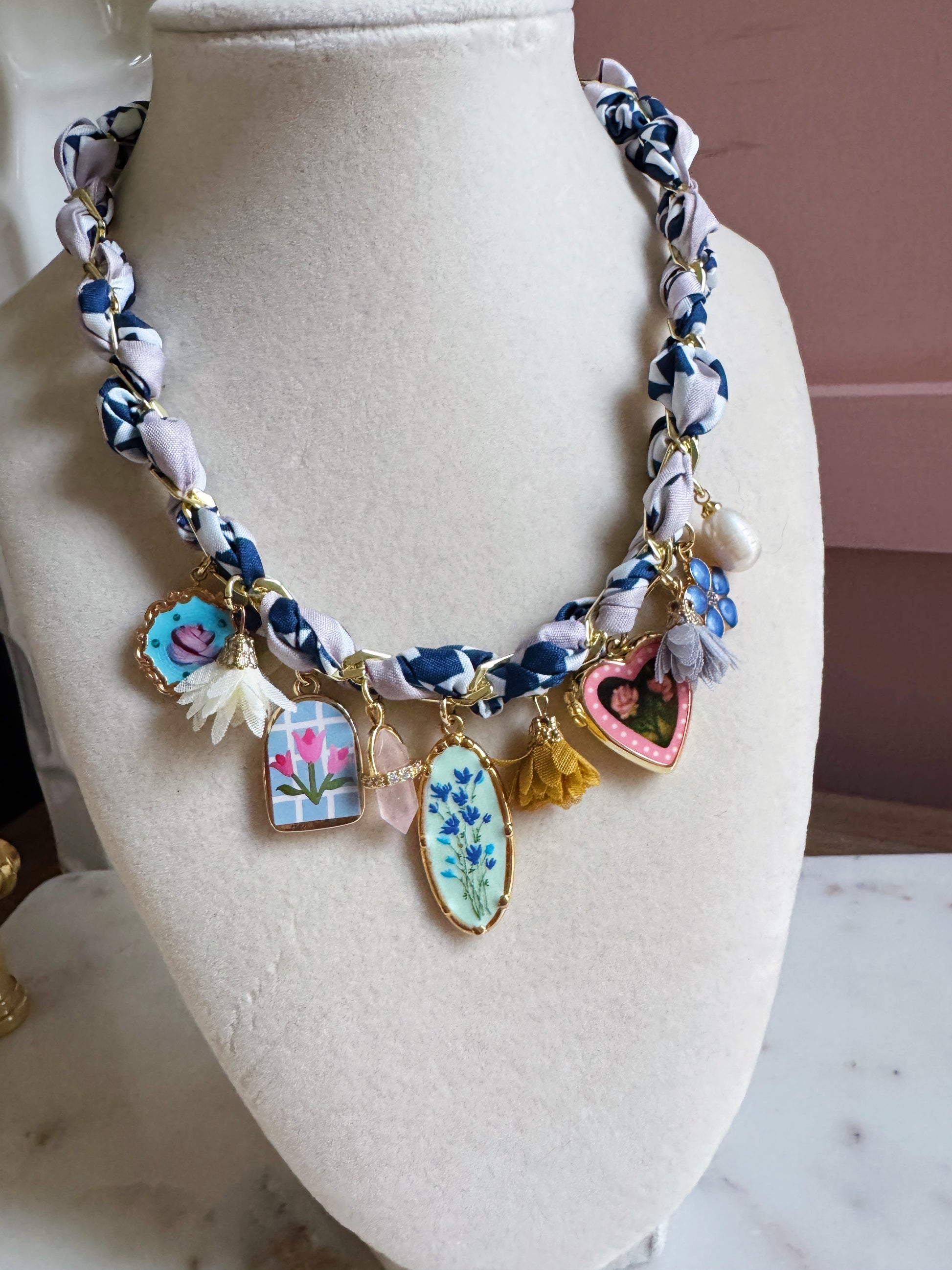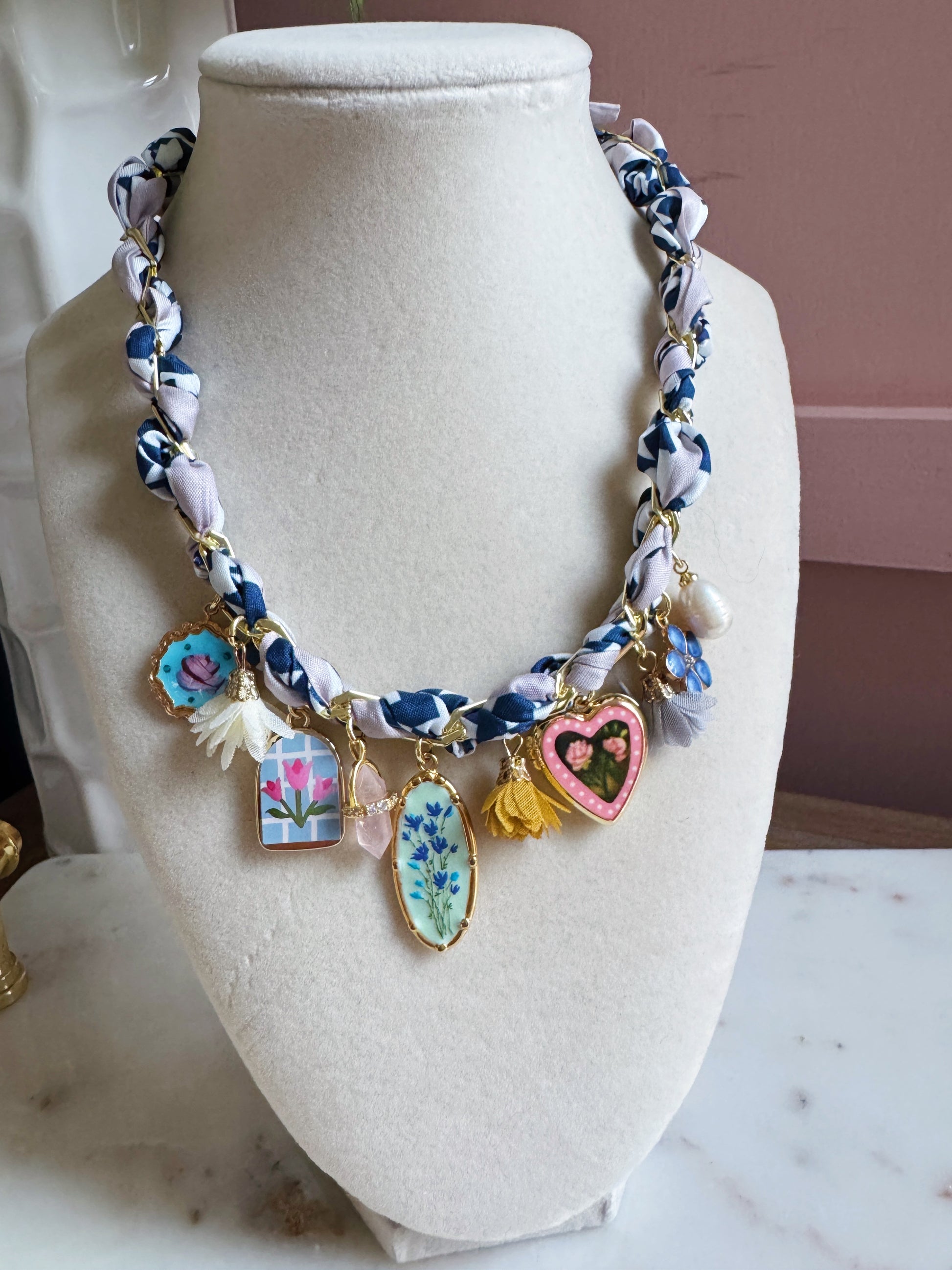 Libby Lou is our perfectly blue and white silk bandana charm necklace with gold filled paperclip chain. She will come with 10 charms as seen in the photo. You can wear her as a choker or layered longer with a tie closure in the back.