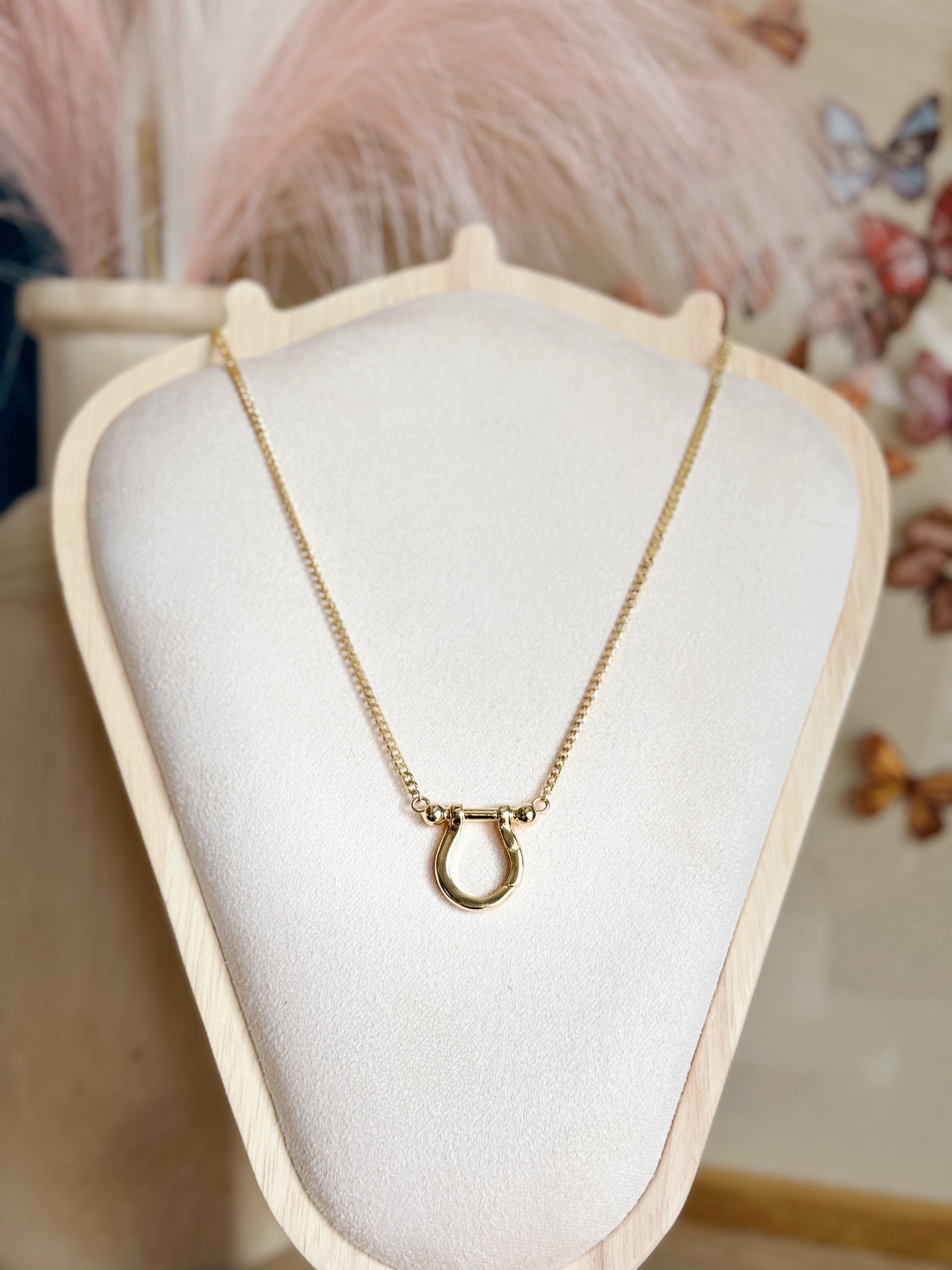 24k gold filled curb chain with horseshoe connector. This has an opening to add charms to the necklace - length is 16.5inches with a 2 inch extender. Total length of necklace is 18.5