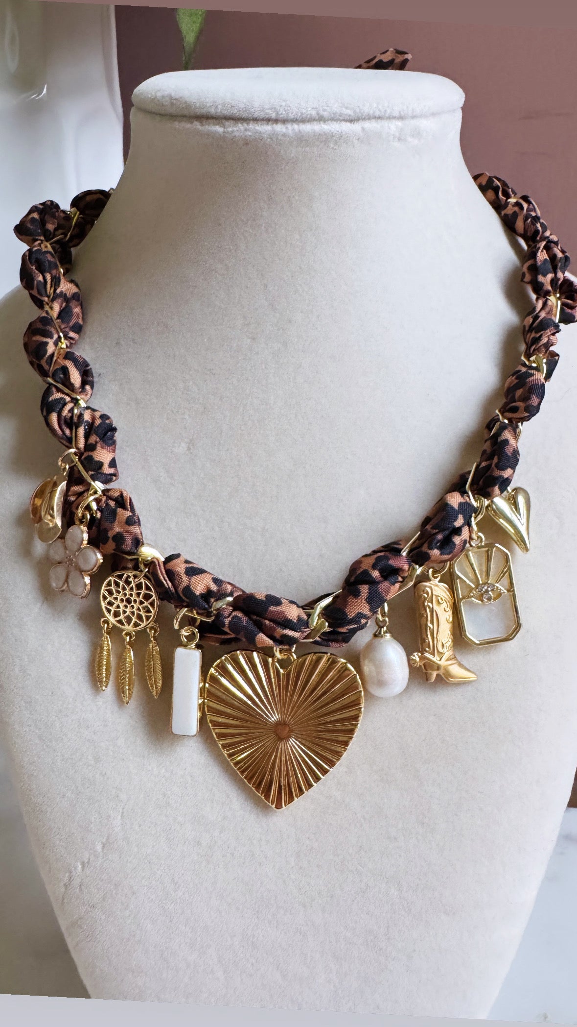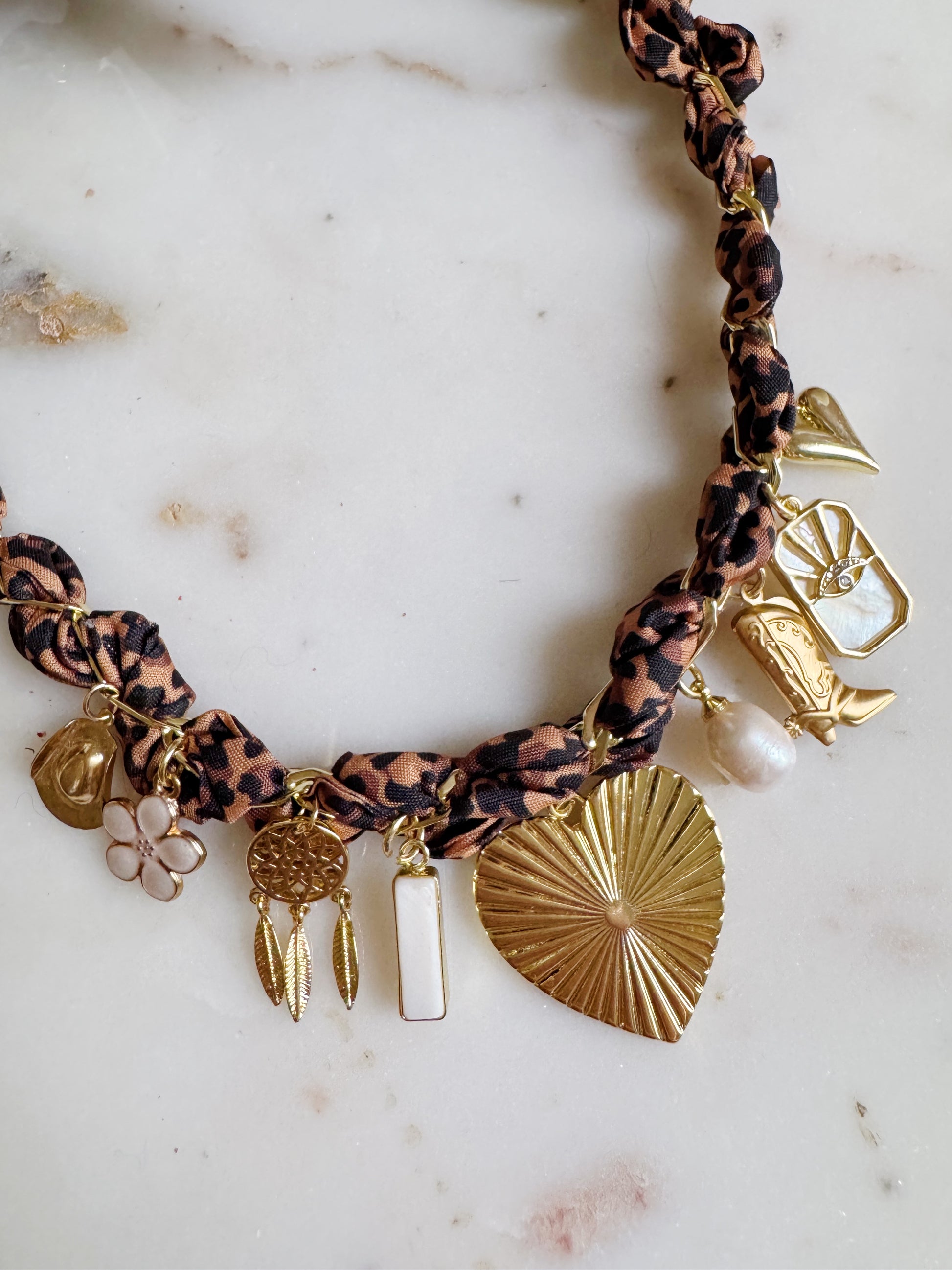Patsy is our perfectly leopard silk bandana charm necklace with gold filled paperclip chain. She will come with 9 charms as seen in the photo. You can wear her as a choker or layered longer with a tie closure in the back.