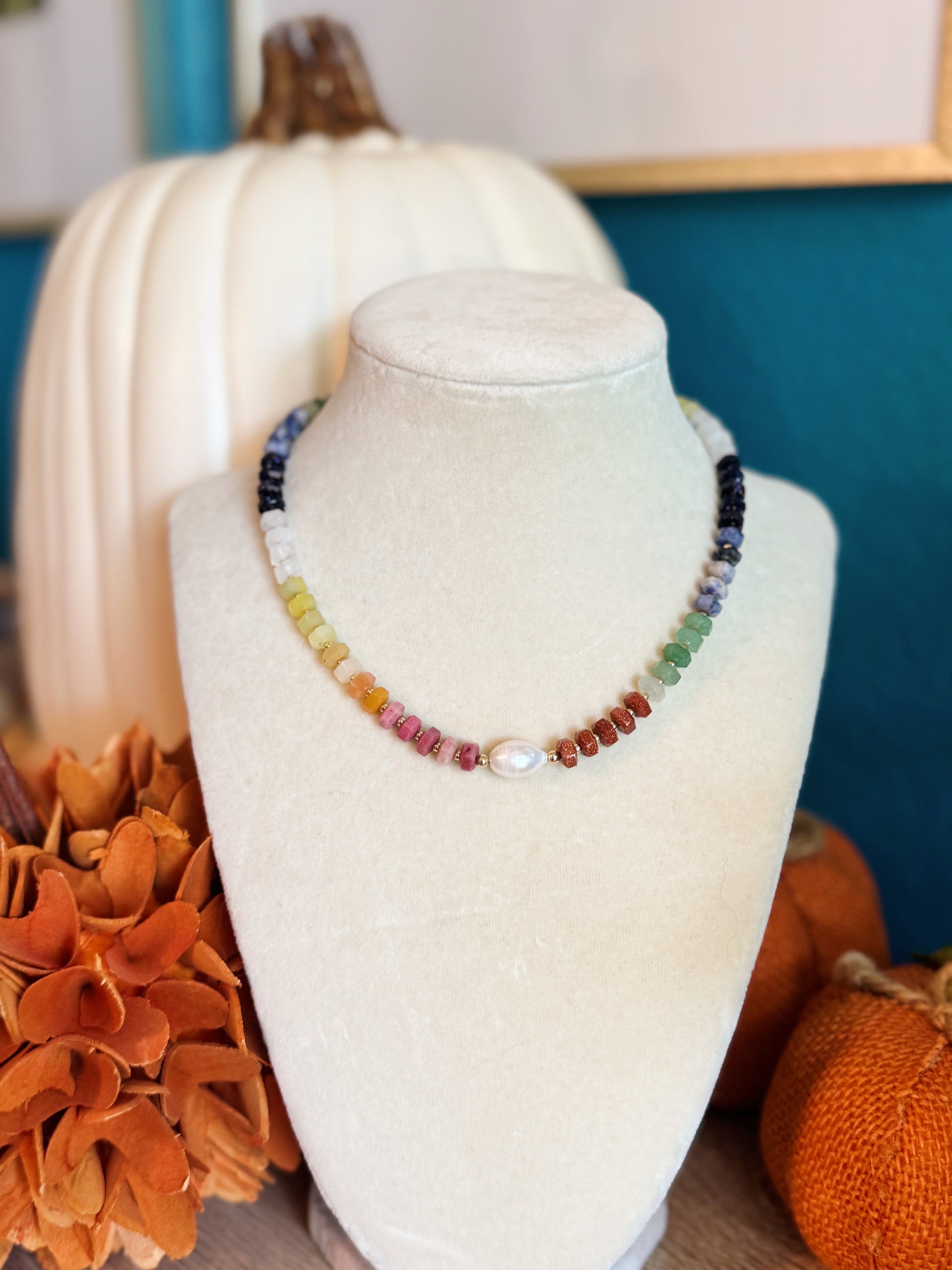 Assorted rondelle cut gemstones with gold filled spacer beads. Choker style necklace 16inch with a extender to wear longer