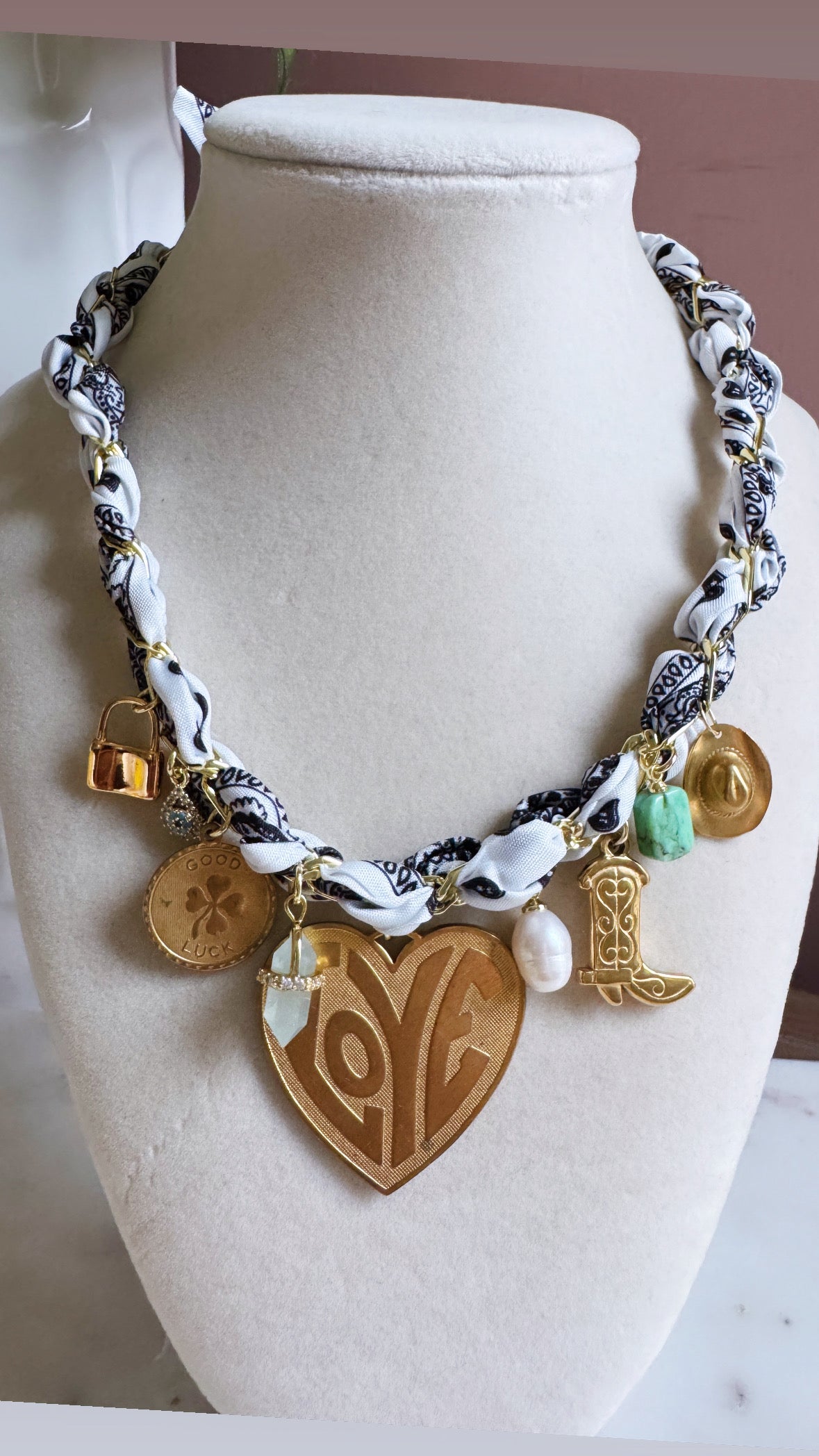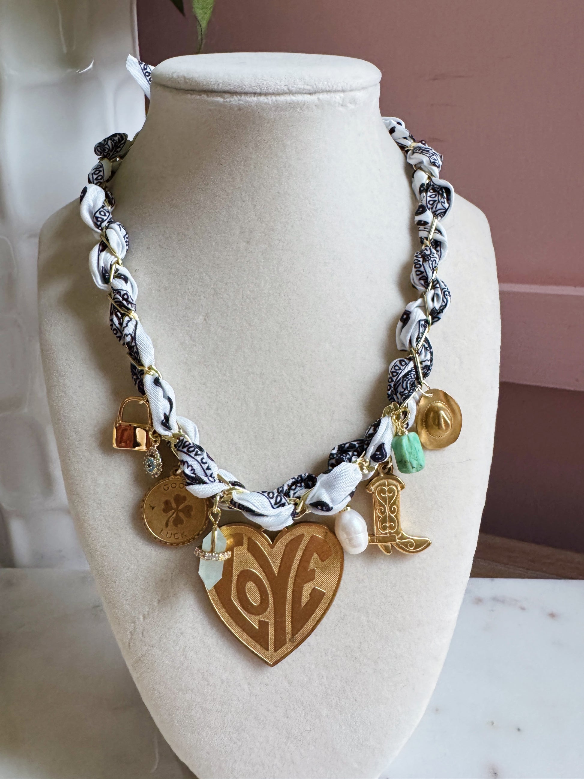 Reese is our perfectly white silk bandana charm necklace with gold filled paperclip chain. She will come with 9 charms as seen in the photo. You can wear her as a choker or layered longer with a tie closure in the back.