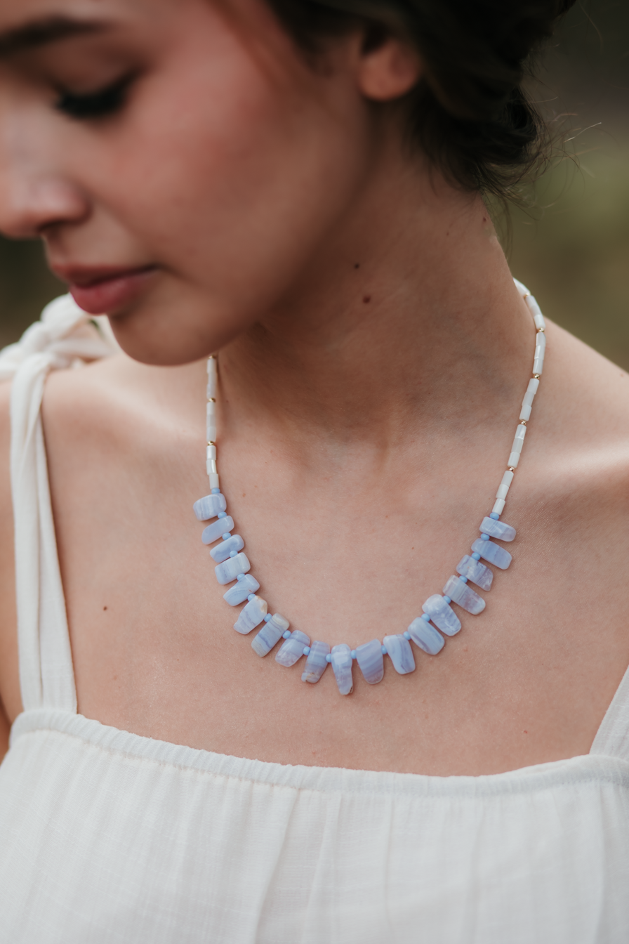 Blue lace agate and mother of pearl beads. Length 18in
