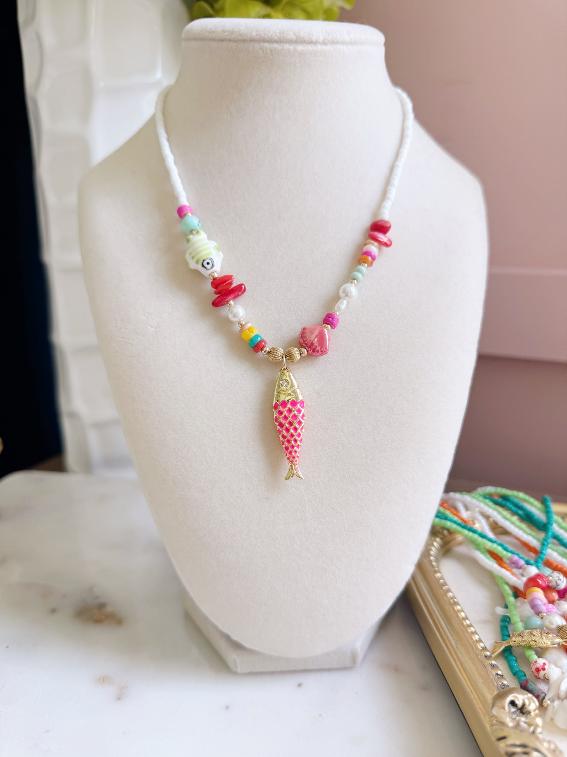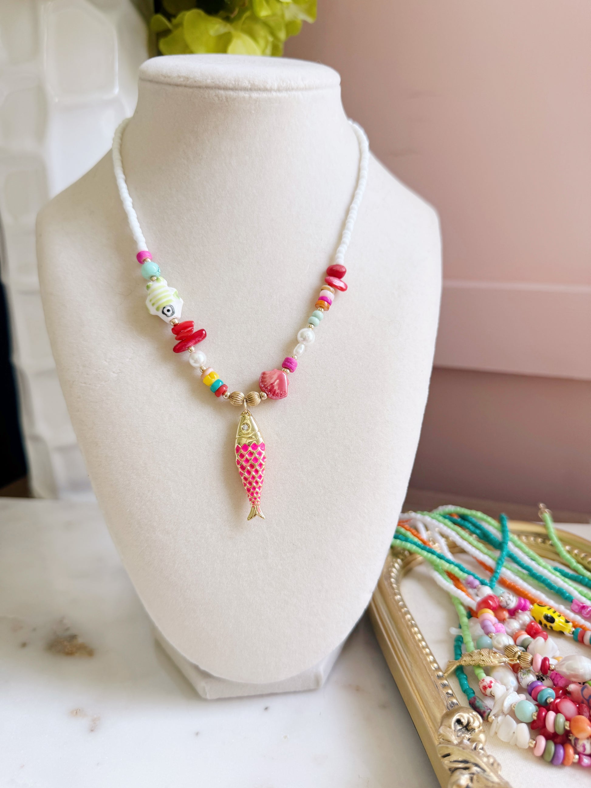 Salty Spark is the newest gem in our summer collection — bursting with color and playful textures. Made with a mix of unique beads and 14k gold-filled hardware, this 17-inch necklace is perfect for adding a bold, beachy glow to any look.