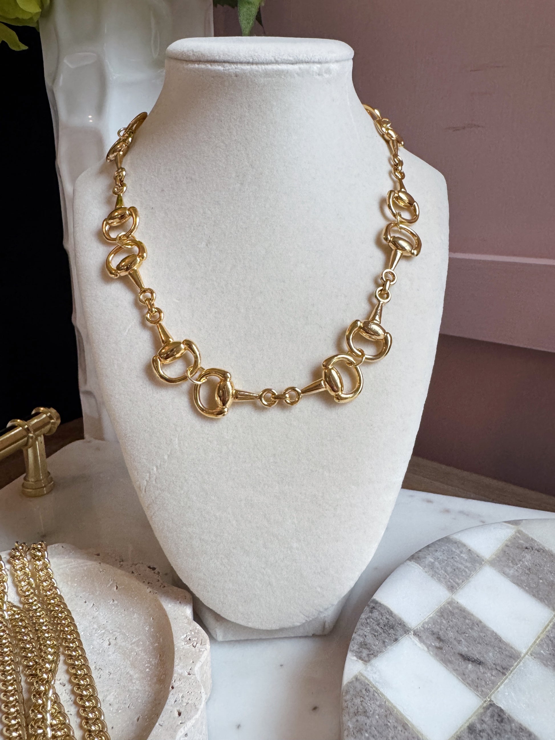 Rodeo girls this is your statement piece. Gold plated snaffle but chain with a sailor clasp closure