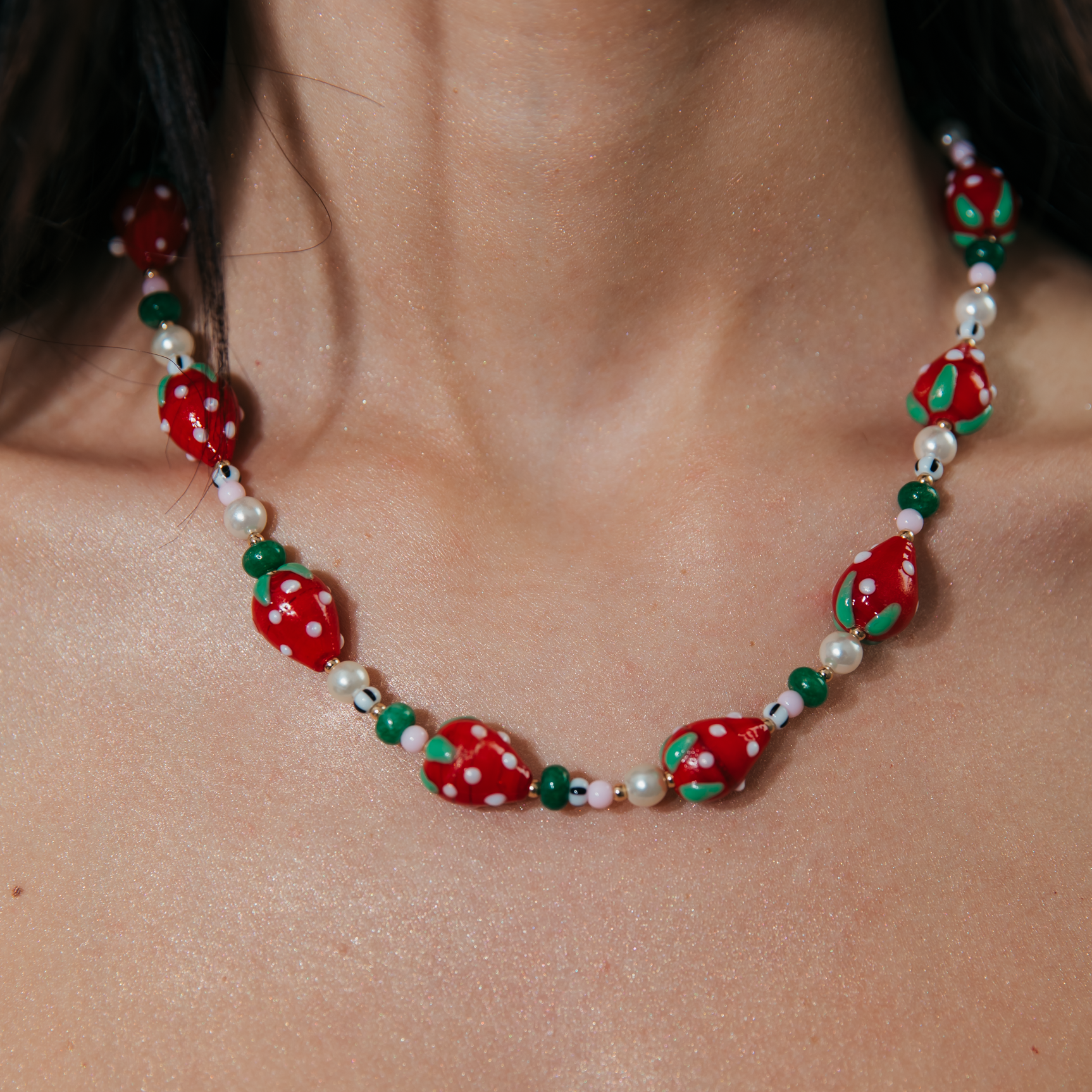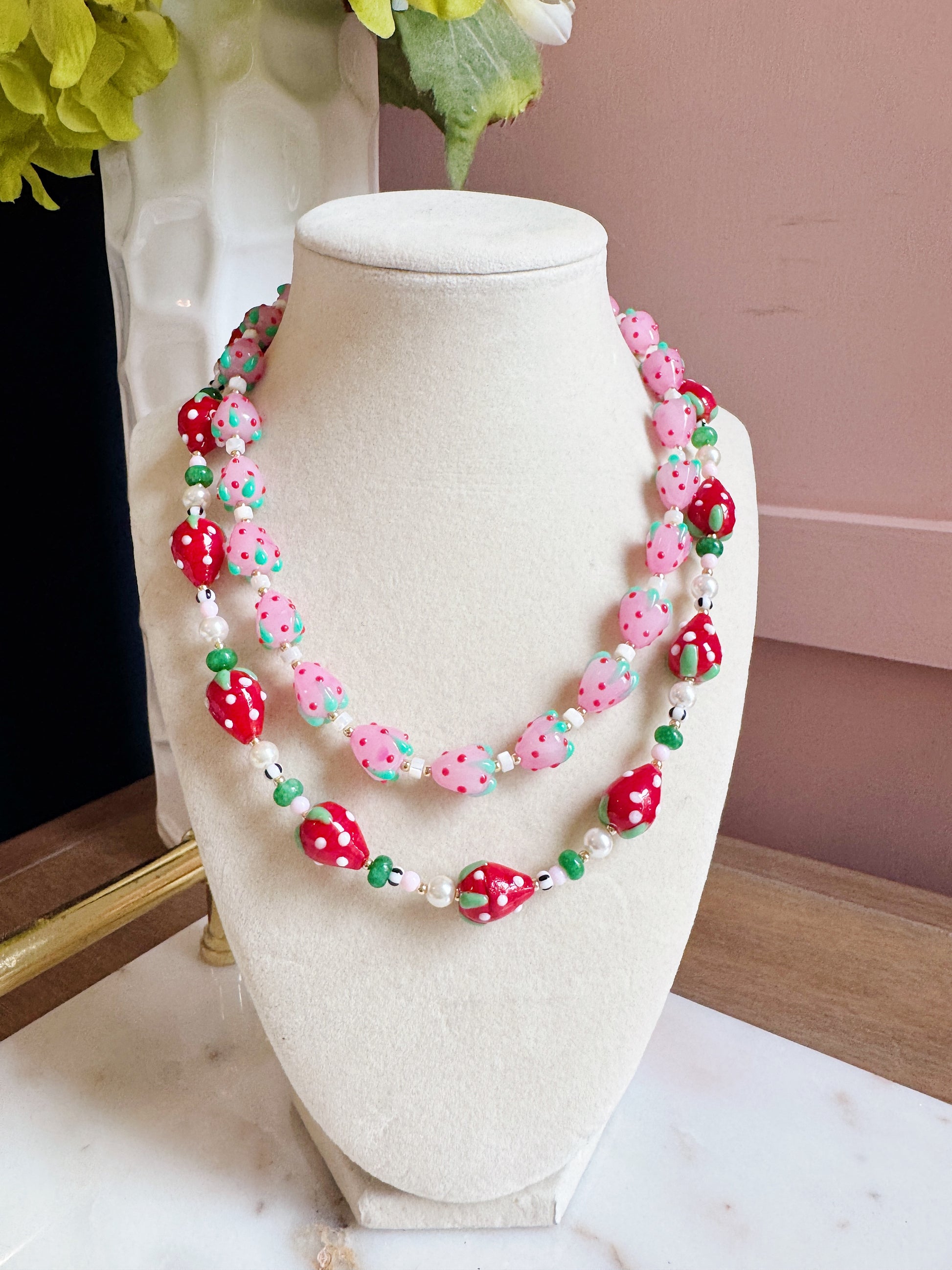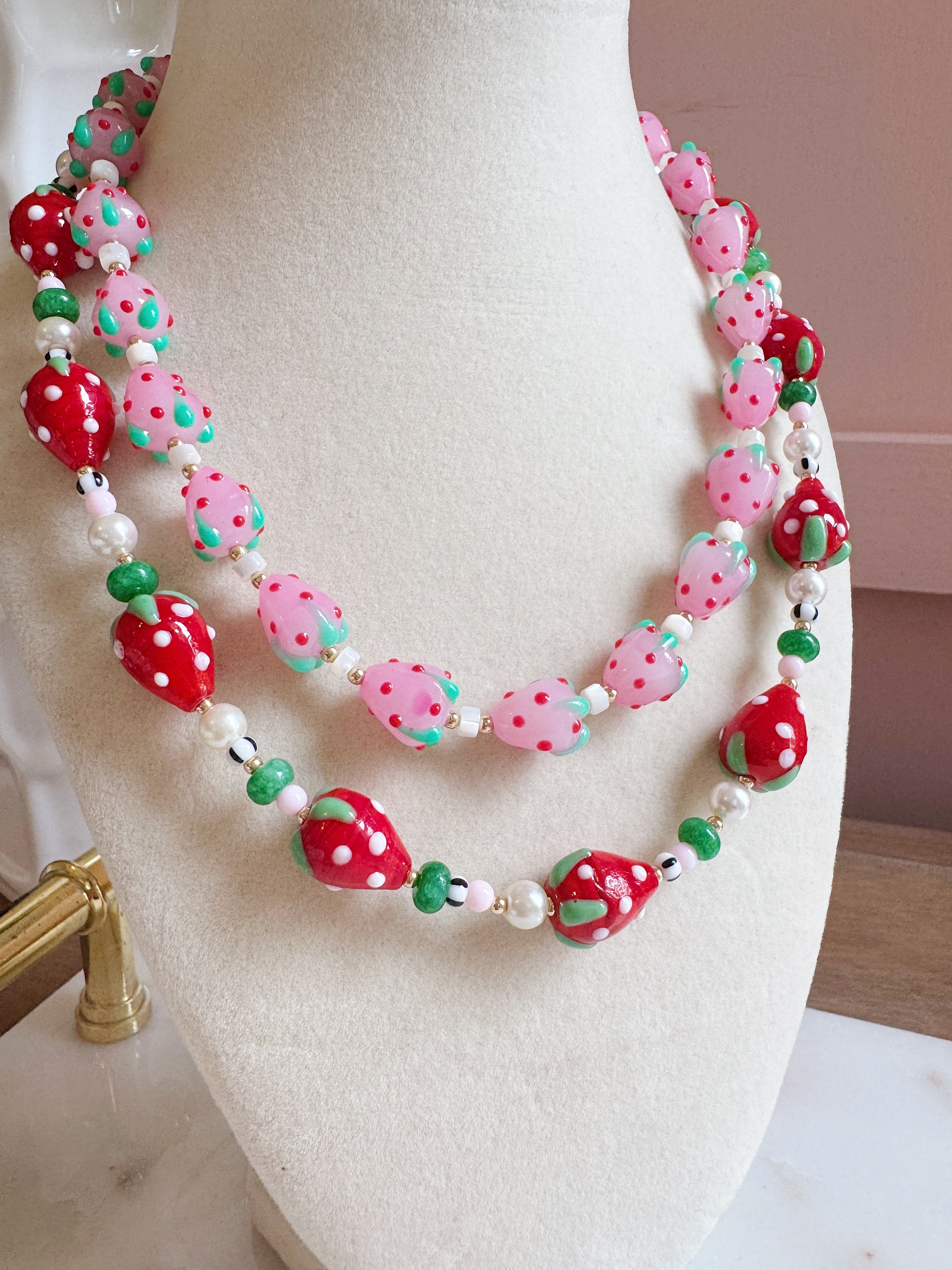 The absolutely sweetest strawberry necklace. Made out of glass beads and gold filled material, so your necklace won’t tarnish. 16.5inches long with a two inch extender