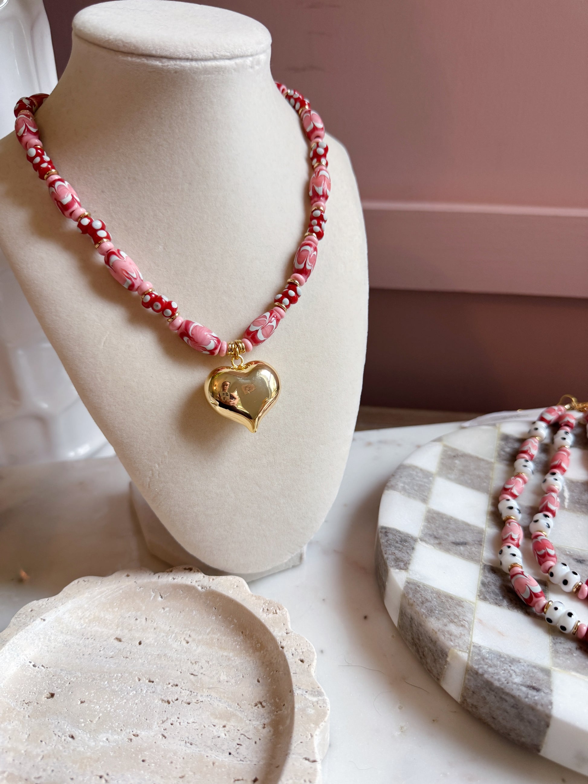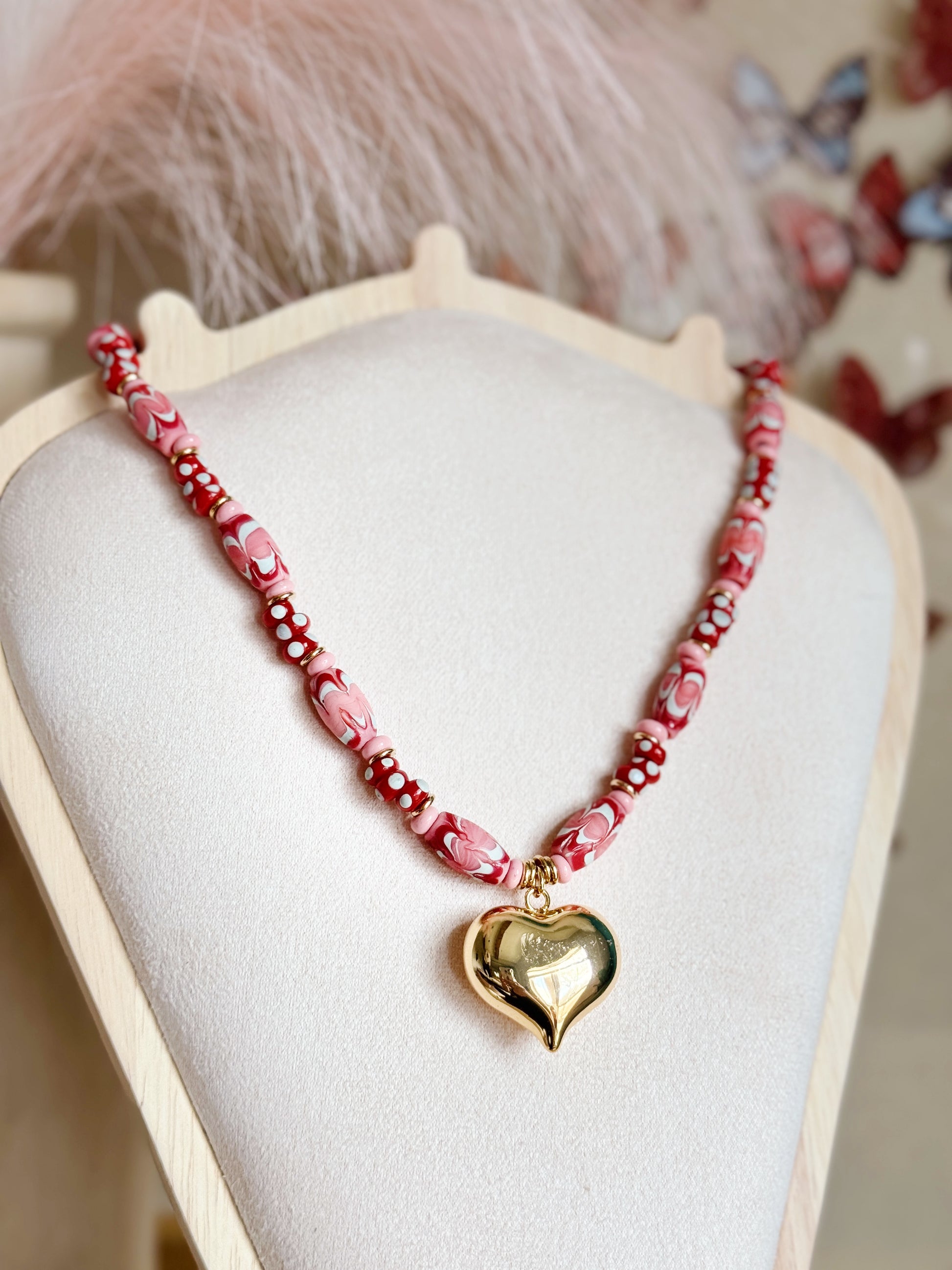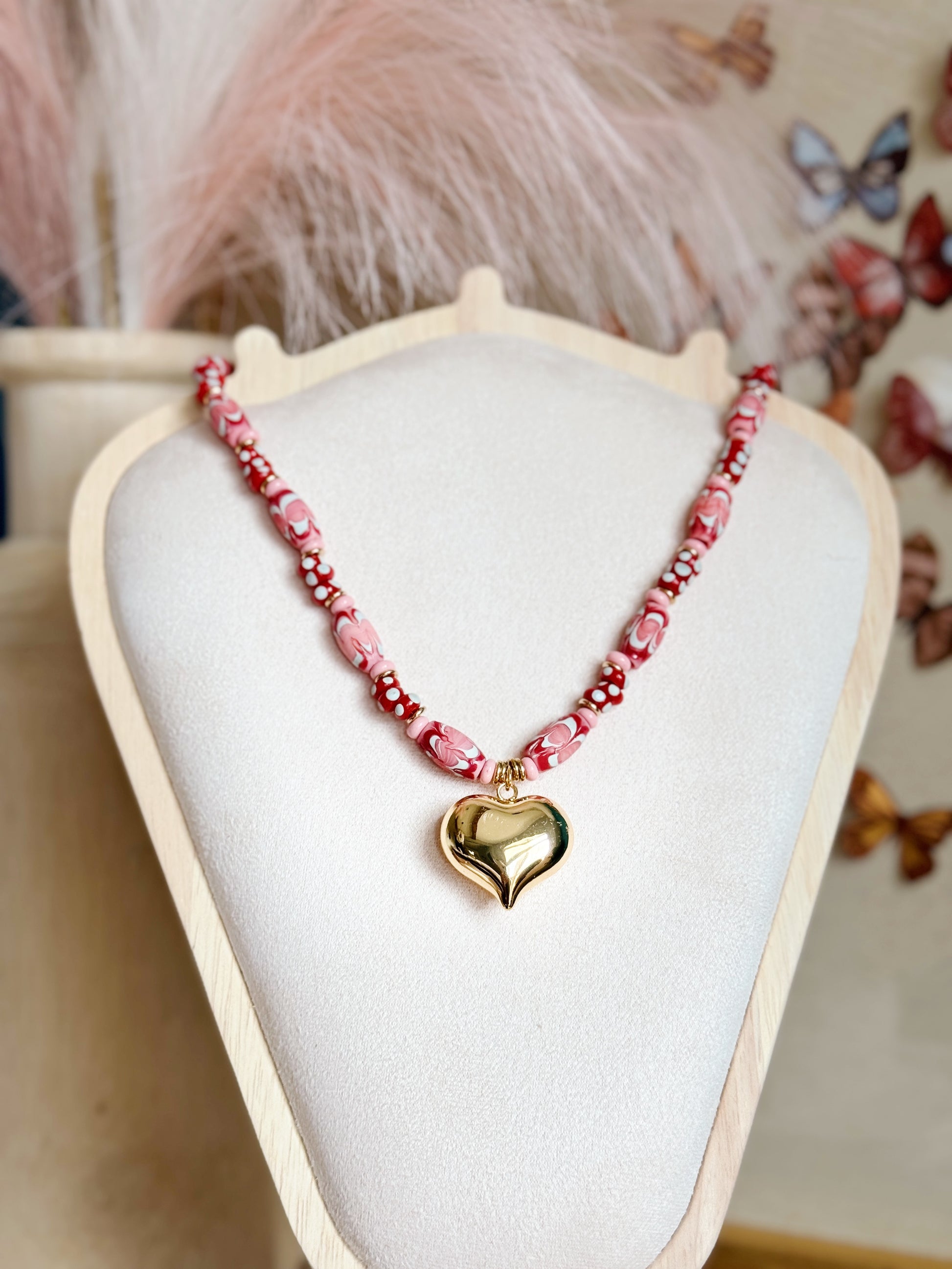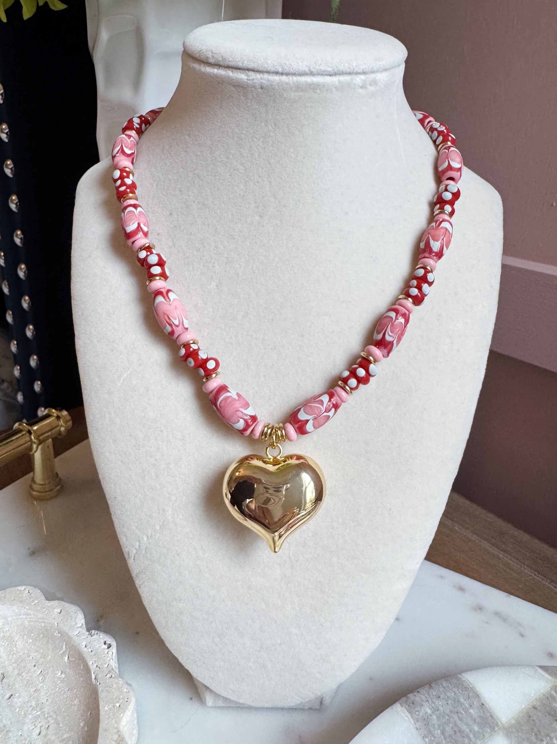 We are loving this piece to make a pop on any OOTD. Blush color themed beads with a big puffy heart and 17.5inches long